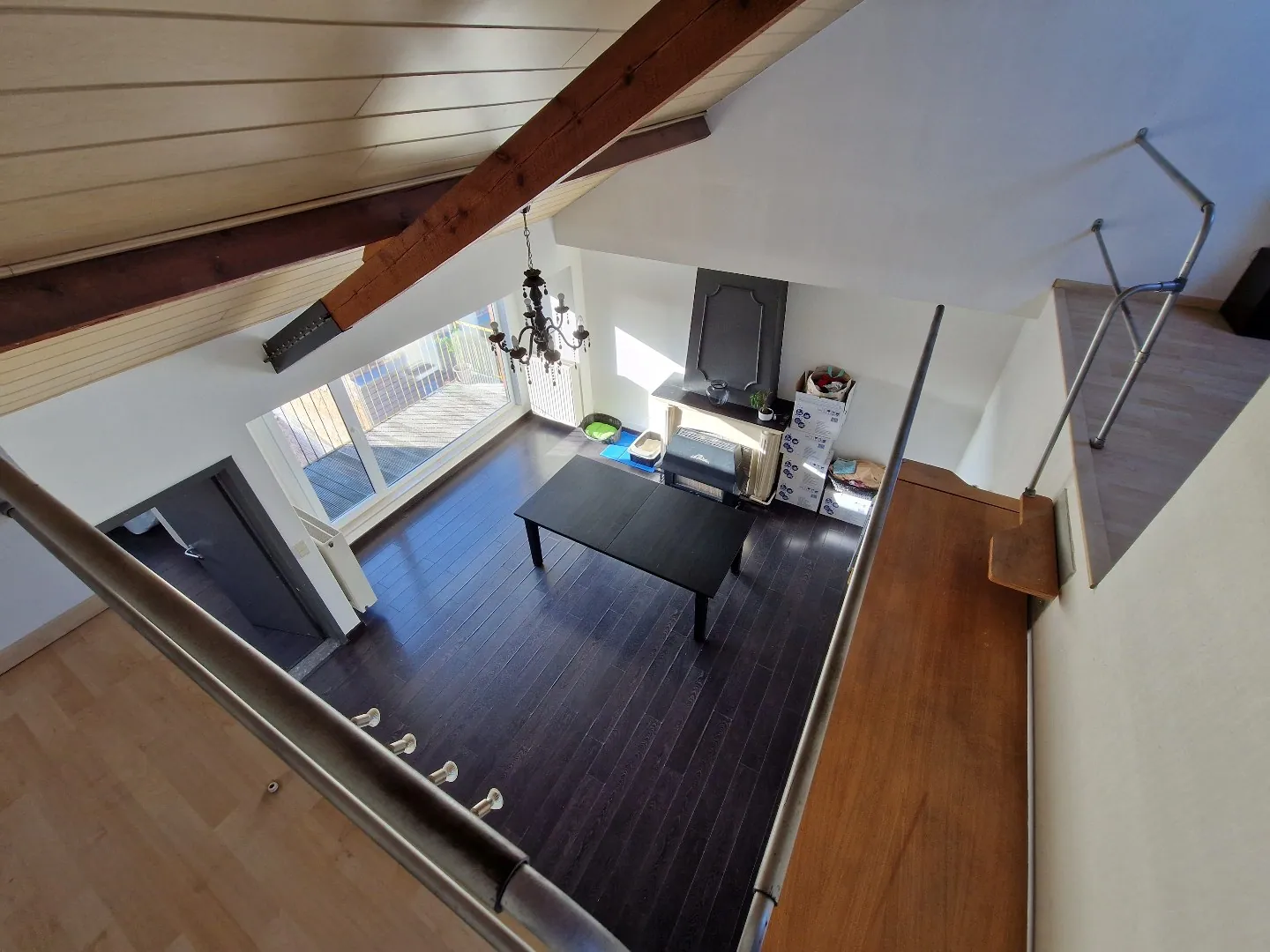 Bovenste appartement (EPC D – 385, verhuurd sinds 2022): inkomhall, trappenhal, gezellige leefruimte, keuken, badkamer, apart toilet, terras, 3 slaapkamers en mezzanine.